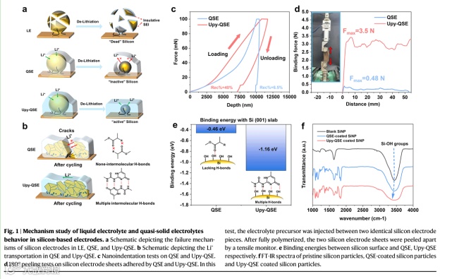 图1. 硅负极在不同电解质(含LE、QSE、Upy-QSE)中的失效方式,以及Upy-QSE的改善机理。