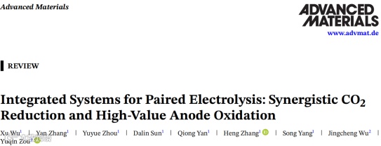 近日,来自贵州大学的张衡教授、武汉科技大学的吴景程副教授与湖南大学的邹雨芹教授合作,在国际知名期刊Advanced Materials上发表题为“Integrated Systems for Paired Electrolysis: Synergistic CO2 Reduction and High-Value Anode Oxidation”的综述文章。该文章分析了现有的电催化CO2RR与低电位、高附加值的阳极氧化反应相耦合的配对电解策略,旨在通过热力学与动力学的协同匹配、电子-质子转移的精准调控以及反应器与膜材料的优化集成,从根本上替代高能耗的OER,从而同步实现大幅降低系统能耗与提升产物经济价值的双重目标。
