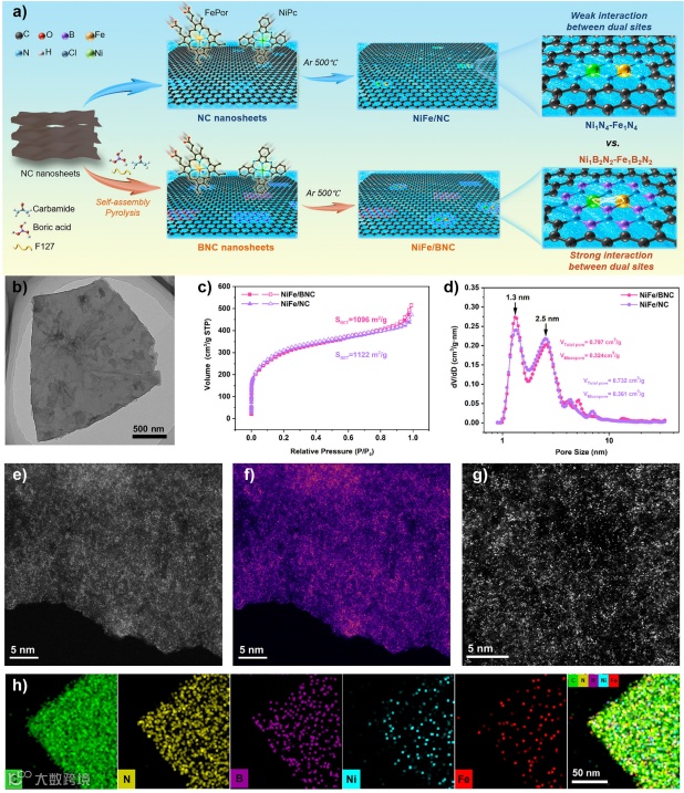 要点一:文章合成NiFe/BNC催化剂并对其微观结构进行表征,确认了Ni、Fe双金属位点与B、N共配位的局部结构。