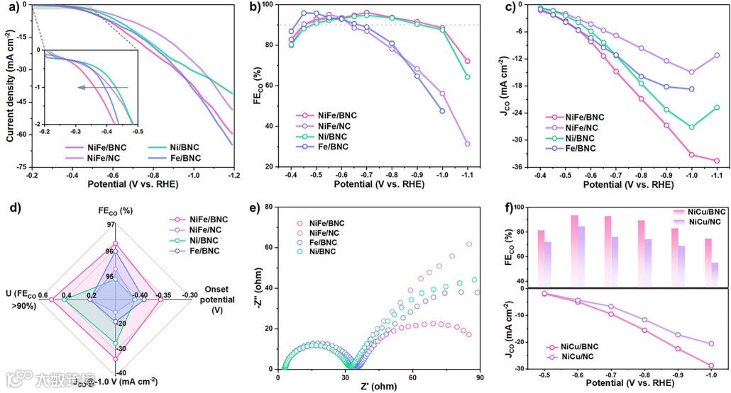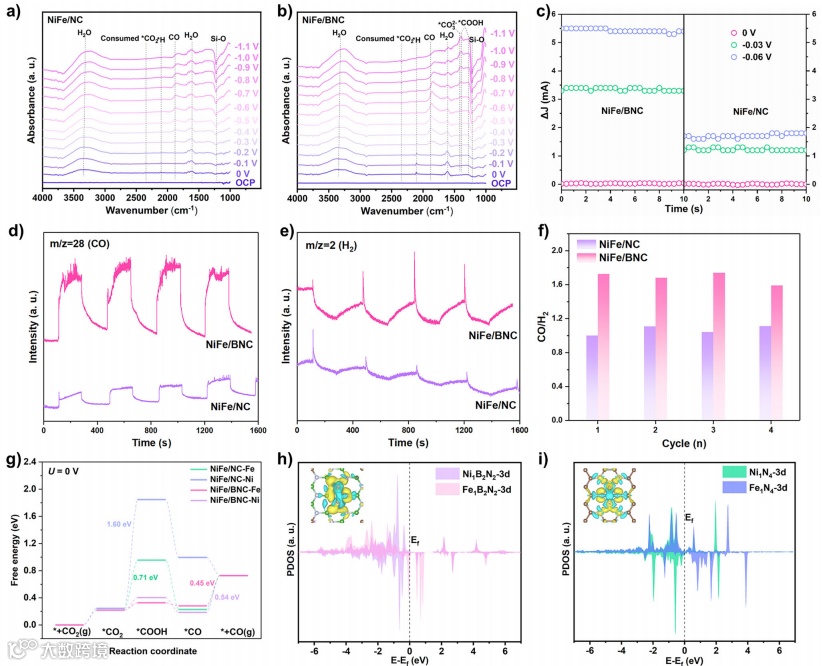 图5. 揭示NiFe/BNC催化剂在CO2RR中的电子结构调控机制与反应路径
