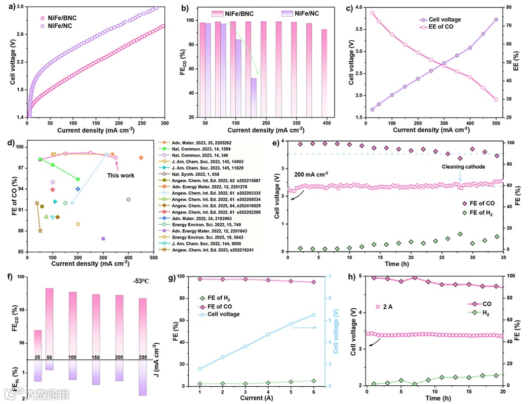 在膜电极电解池测试中,基于NiFe/BNC阴极的电解池展现出优越的性能。在50至400 mA cm-2的宽电流范围内,其对CO的选择性均维持在98%以上。在200 mA cm-2的工业相关电流密度下,槽电压仅为2.38 V,高能量效率达到55.7%,且能稳定运行35小时以上,CO选择性始终高于90%。该催化剂展现出良好的普适性与极端环境适应性,在-53 ℃的模拟火星环境下仍能实现超过200 mA cm-2的电流密度和98%的CO选择性。此外,在大面积MEA电解池(100 cm2)中,在1至6 A的大电流下可稳定运行,CO选择性超过95%,并在2 A电流下连续运行20小时保持90%以上的法拉第效率,证明其具有较好的工业应用潜力。(图4)。