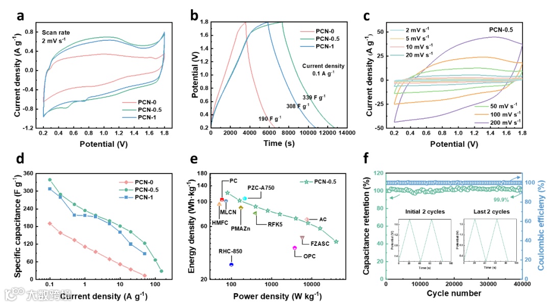 优化制备的PCN-0.5材料(MA/AL = 0.5)具有最高的0.6–1 nm微孔比例(23.8%)和1–2 nm微孔比例(30.0%),并结合了丰富的边缘氮和羰基(C=O)活性位点。基于该正极组装的ZIHCs展现了优异的综合性能:高比电容(339 F g-1 at 0.1 A g-1)、出色的倍率性能(66 F g-1 at 100 A g-1)和超长循环寿命(40,000次循环后容量保持率99.9%),其能量密度高达121 Wh kg-1(80 W kg-1),即使在超高功率密度40,435 W kg-1下仍能保持44 Wh kg-1。