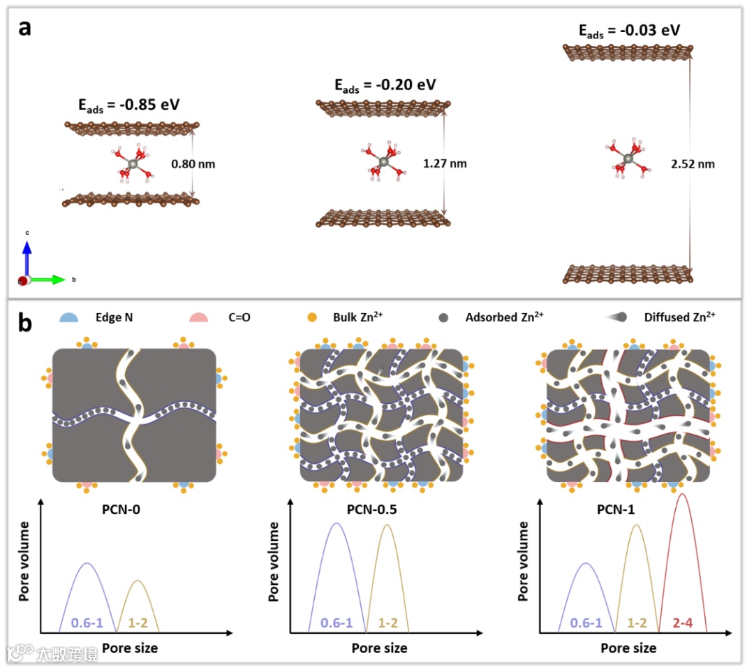 图1 (a)[Zn(H2O)6]2+在双层石墨烯上的吸附能分别为0.80nm、1.27nm和2.52nm;(b)1-2 nm微孔在PCNs电荷储存过程中的作用示意图。