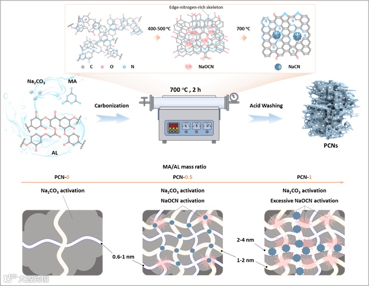 本文开发了一种新颖的NaOCN与Na2CO3耦合化学活化策略,用于精确调控多孔碳纳米片(PCNs)的孔结构。通过调控前驱体中三聚氰胺(MA)与碱木质素(AL)的质量比,实现了对0.6–1 nm微孔、1–2 nm大微孔及2–4 nm介孔的可控制备。该策略克服了传统化学活化(如KOH)易造成孔道曲折和杂原子损失的问题,为设计高性能锌离子混合电容器(ZIHCs)正极材料提供了新途径。