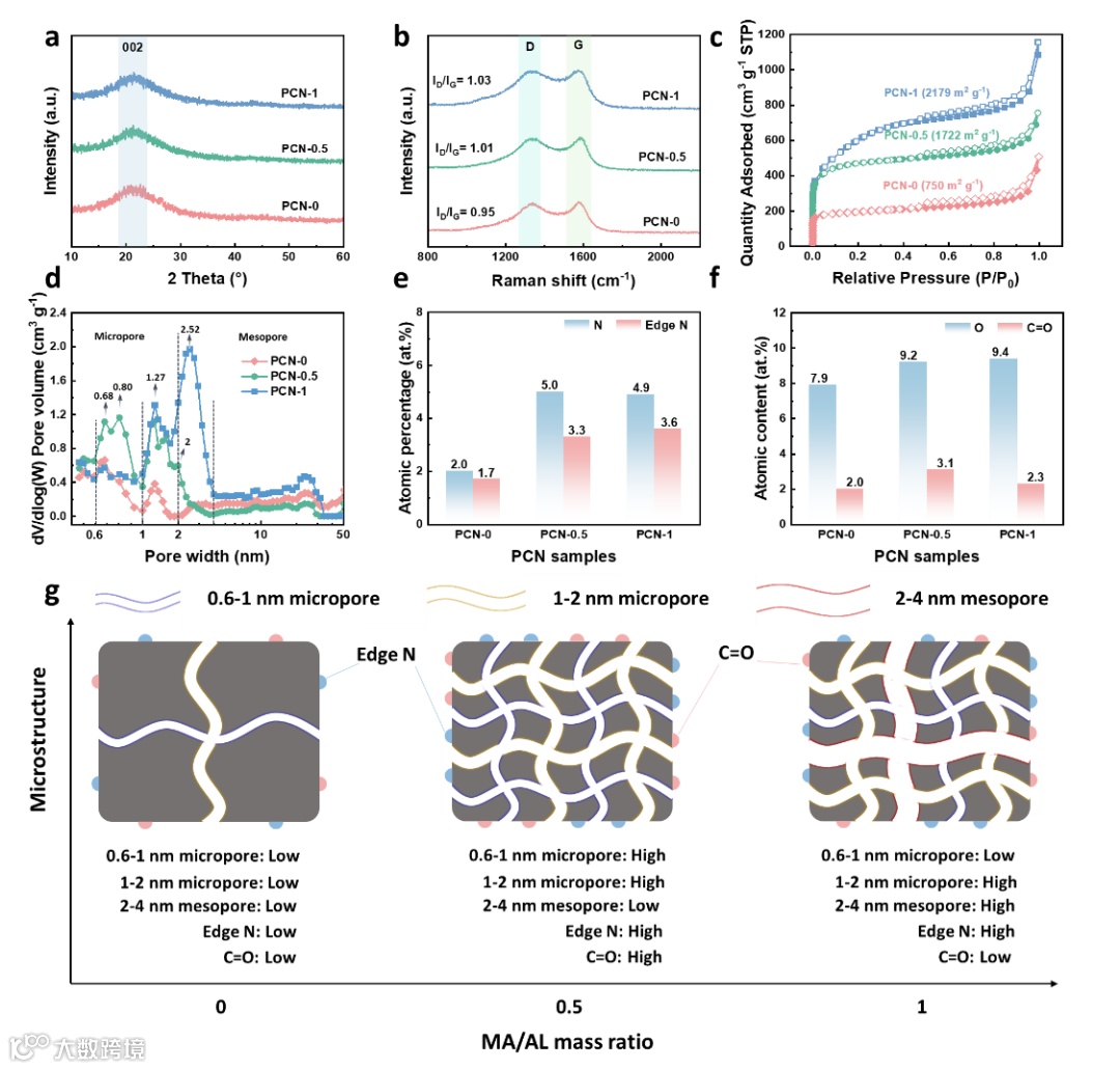 图3 (a)XRD图谱;(b)拉曼光谱;(c)N2吸附-解吸等温线;(d)孔径分布;(e)PCNs边缘N含量和(f)C=O含量;(g)取决于MA/AL质量比的显微组织演变示意图