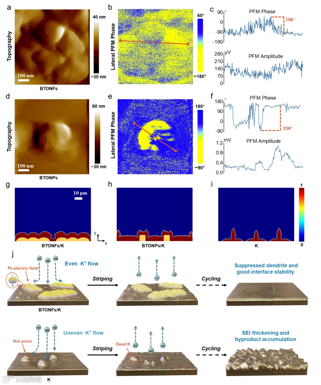 BTONFs具有各向异性的多畴结构,这种结构使得在电化学沉积的初始阶段有快速的铁电响应,产生均匀而致密的极化场。极化场通过静电相互作用,重新排列表面电荷,有效地使表面电场均匀化,从而减轻局部离子浓度梯度。然后,阻止K+离子的局域富集,增加活性成核位点的密度,最终引导形成均匀的平面沉积表面。接下来,在随后的剥离过程中,最初均匀的沉积层促进了离子更平衡的溶解,最大限度地减少了“死”K的形成和副产物的积累。因此,即使经过多次电镀/剥离循环,BTONFs/K阳极也能保持稳定的界面。相反,在裸K阳极上,严重的局部电场和浓度梯度导致尖端优先沉积,形成粗糙的沉积表面,剥离后留下大量“死”K。这个“死的”K不断与电解质发生反应,不仅消耗电解质,而且导致SEI增稠和副产物积累,最终导致界面稳定性急剧恶化。