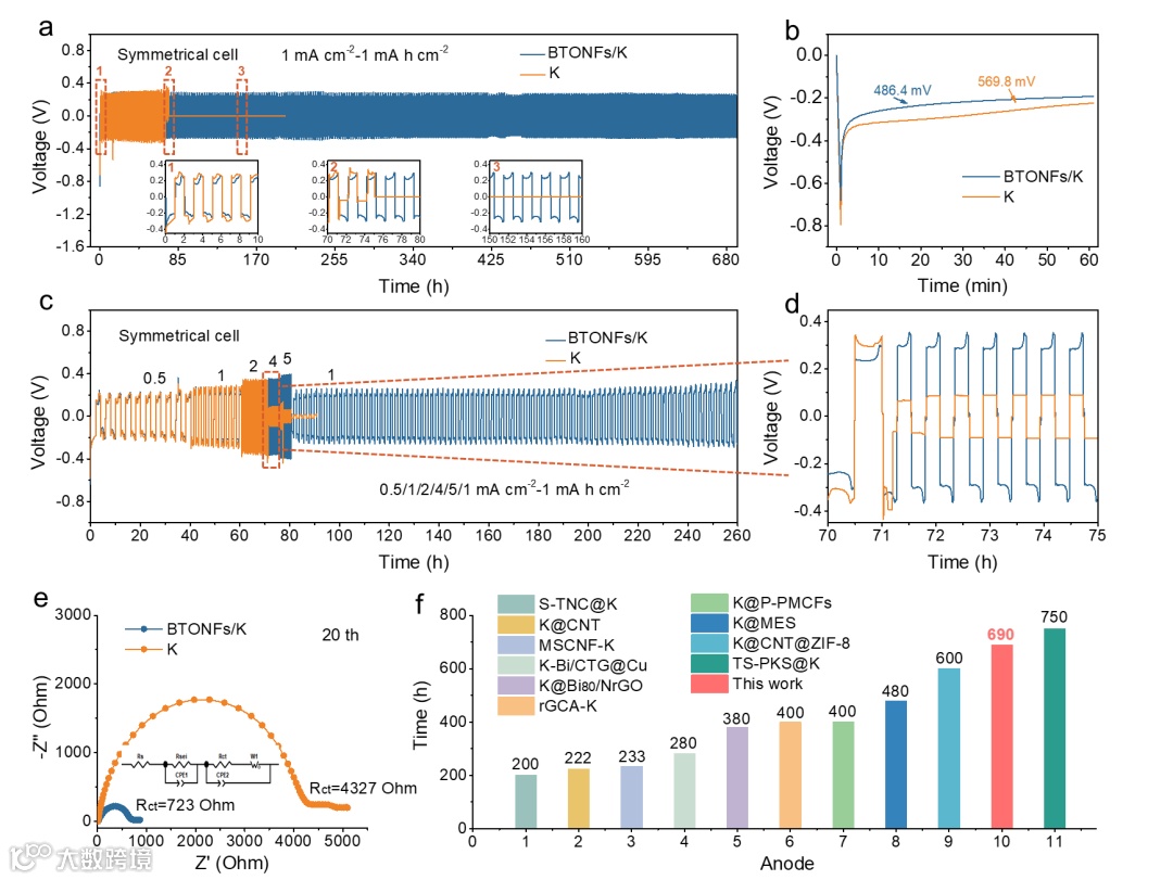 图2. BTONFs/K负极在对称电池中的电化学性能。