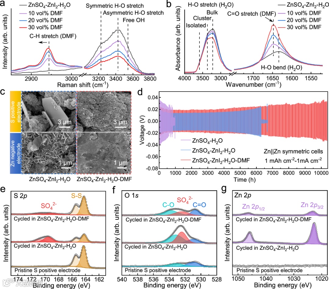 图5. (a,b)不同DMF浓度的ZnSO4-ZnI2-H2O电解液的拉曼和FTIR光谱。(c)25°C和0.1 C下,在ZnSO4-ZnI2-H2O和ZnSO4-ZnI2-H2O-DMF电解液中循环150次后硫正极和锌负极的SEM图像。(d)在1 mAh cm-2和1 mA cm-2下,不同电解液中Zn||Zn对称电池的循环性能。(e,f)循环后硫正极的S 2p和O 1s XPS光谱。(g)循环后锌负极的Zn 2p XPS光谱。