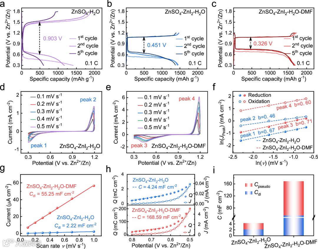 图1. (a–c)使用ZnSO4-ZnI2、ZnSO4-ZnI2-H2O和ZnSO4-ZnI2-H2O-DMF电解液的Zn||S电池在25°C和0.1 C下的恒电流充放电曲线。(d,e)Zn||S电池在ZnSO4-ZnI2-H2O和ZnSO4-ZnI2-H2O-DMF电解液中,扫描速率从0.1到0.5 mV s-1下的CV曲线。(f)还原/氧化峰值电流密度与扫描速率在对数图中的比例关系。(g)平均电流密度与扫描速率的线性拟合以获得不同电解液中硫电极的EDL电容。(h)根据脉冲伏安法得出的累积电荷(Q)与脉冲电位的关系图。(i)EDL电容和赝电容贡献的比率。