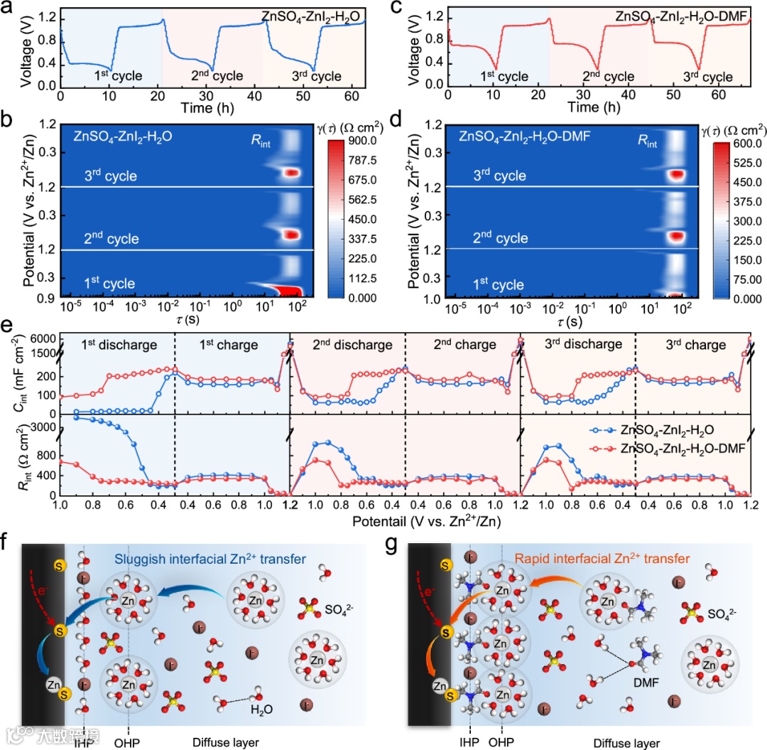 在不同电位下进行原位电化学阻抗谱(GEIS)结合弛豫时间分布(DRT)分析(图3a–d);基于多孔电极传输线模型(TLM),识别出硫转化反应中不同电化学过程的弛豫时间(τ):高频区(10⁻⁸ s < τ < 10⁻² s)对应电极与集流体间的接触电阻(Rcon),中频区(10⁻² s < τ < 1 s)对应电极孔隙中的离子输运电阻(Rion),低频区(1 s < τ < 10² s)对应界面电荷转移电阻(Rint)(其数值最大,是硫转化反应动力学的关键步骤),且该界面电荷转移过程主要由Zn²⁺界面迁移控制。图3e呈现前三个充放电循环中不同电解液下硫电极界面电容(Cint)与电荷转移电阻(Rint)的动态演变:放电过程中Rint和Cint显著变化,Cint在充放电曲线平台电位处出现拐点(标志相转变反应发生),Rint在拐点前明显下降(表明Zn²⁺界面富集,促进迁移动力学,对应硫还原反应赝电容行为),由此推断界面电荷积累是激活硫纳米颗粒向ZnS相变的必要条件(EDL区域需足够Zn²⁺富集)。在ZnSO4-ZnI2-H2O电解液中,初始Cint极低、Rint较高(反映电极润湿性差),硫的相转变电位仅为0.45V(vs. Zn²⁺/Zn);引入DMF共溶剂后,初始Cint显著提高(DMF特异性吸附与润湿性改善使OHP层Zn²⁺积累增加),相转变电位提升至0.75V,且后续循环中平台电位随Cint初始值上升而升高(与界面活化现象一致),同时含DMF电解液的Rint在充放电过程中保持稳定(纯水基电解液中Rint波动明显),说明DMF可构建更稳定的EDL结构,更高的Cint也证实其电荷转移速率更快。图3f、g进一步揭示,DMF分子优先吸附于电极表面,排挤水偶极子形成贫水IHP(抑制水分子导致的ZnS失活),且其羰基(-C=O)与Zn²⁺的强相互作用促进OHP中Zn²⁺电荷积累,最终在硫电极界面构建“贫水IHP-富Zn²⁺ OHP”结构,有效促进界面Zn²⁺传输并提升硫转化反应动力学。