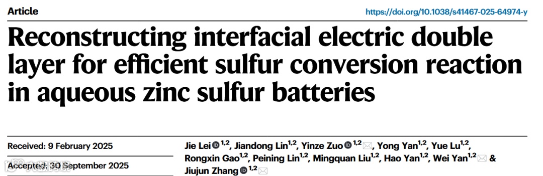 近日,福州大学张久俊院士、雷杰、左银泽、颜蔚团队在Nature Communications期刊发表题为“Reconstructing interfacial electric double layer for efficient sulfur conversion reaction in aqueous zinc sulfur batteries”的研究论文。该文章以“重构双电层”为核心,创新设计ZnI2+N,N-二甲基甲酰胺(DMF)混合电解液,实现水系Zn||S电池性能上质的飞跃。