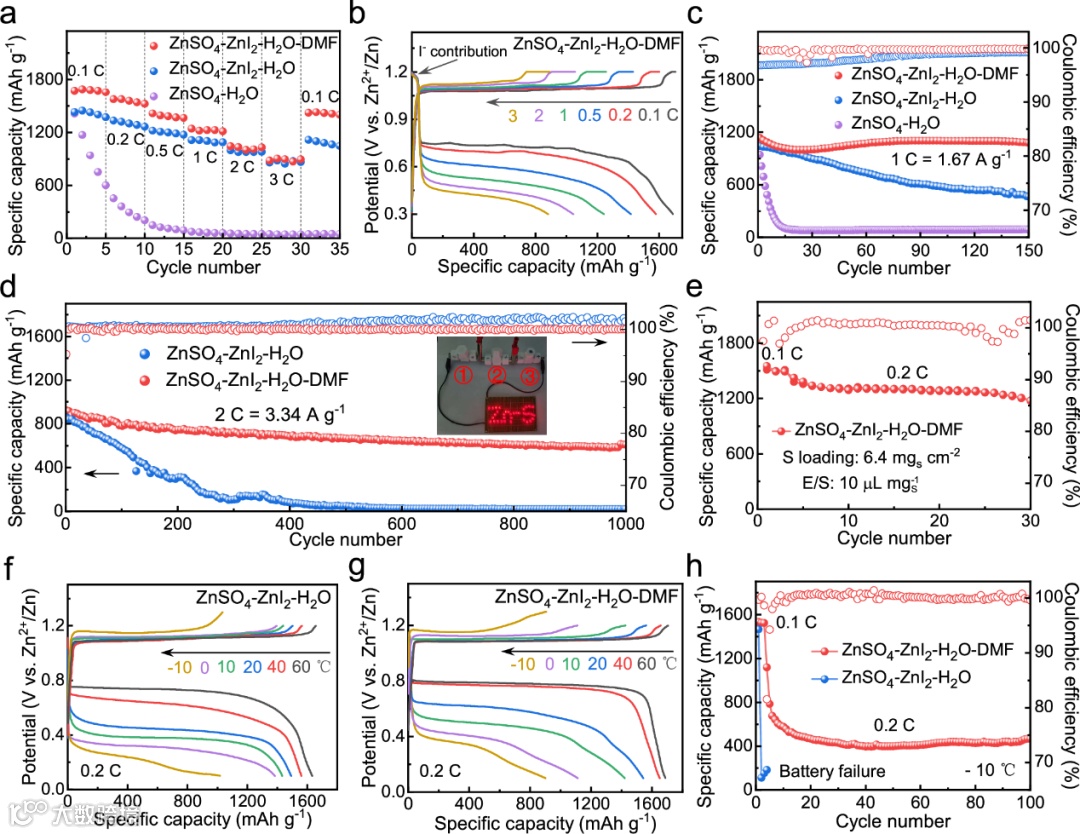 图6a的倍率性能测试结果显示,传统ZnSO₄-H₂O电解液因容量持续衰减、电池快速失效,无法支持Zn||S电池正常工作;相较于ZnSO₄-ZnI₂-H₂O电解液,含DMF的ZnSO₄-ZnI₂-H₂O-DMF电解液在低倍率下比容量更高,但高倍率下受粘度增大、离子电导率下降影响,容量与前者相近——具体而言,1 C至3 C倍率下,ZnSO₄-ZnI₂-H₂O电解液体系的可逆比容量分别为1643、1534、1372、1198、1000和837 mAh g⁻¹,含DMF电解液因浓差极化较大,倍率升高时容量衰减更明显,但图6b显示其高倍率下仍存在显著降低的电压滞后,表明DMF可有效降低活化极化,且高倍率下活化极化仍是硫转化反应的主导因素。循环稳定性方面(图6c),ZnSO₄-ZnI₂-H₂O-DMF电解液表现优异,1 C倍率循环150次后放电比容量仍保持在1080 mAh g⁻¹ 以上,每圈库仑效率接近 100%,而无 DMF 体系(尤其传统ZnSO₄-H₂O电解液)容量衰减显著,证实DMF可提升循环稳定性。长期循环测试(图6d)进一步验证该优势:ZnSO₄-ZnI₂-H₂O电解液体系比容量迅速下降至近乎无输出,含DMF体系在2 C下循环1000 圈后仍能释放约610 mAh g⁻¹比容量,容量保持率达99.966%(每圈仅衰减0.034%),且三个串联的Zn||S叠层电池成功点亮LED灯(图6e)。不同温度性能测试(图6f–g)表明,加入DMF后电压滞后显著降低,但受离子电导率下降影响,可逆容量略有下降;低温环境(-10℃)下含DMF电解液优势更突出(图6h),0.2 C倍率循环100次后仍保持500 mAh g⁻¹可逆容量,而ZnSO₄-ZnI₂-H₂O电解液体系迅速失效,说明DMF在低温Zn||S体系中同样具备应用潜力。