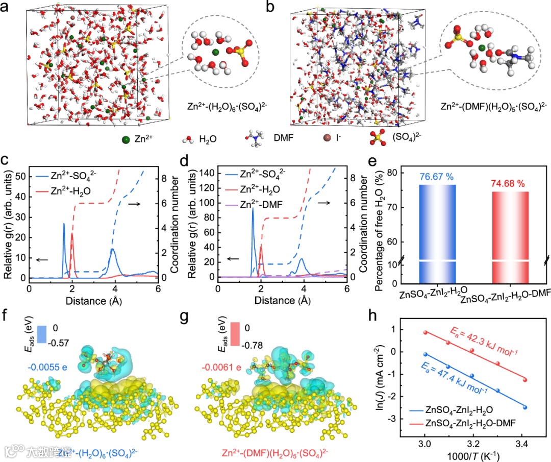 图4. (a,b)来自MD模拟的ZnSO4-ZnI2-H2O和ZnSO4-ZnI2-H2O-DMF电解液3D快照以及代表Zn2+溶剂化结构的局部放大快照。(c,d)Zn2+、SO42-、H2O和DMF之间的径向分布函数(RDF)和相应配位数。(e)来自MD模拟的不同电解液中自由H2O的百分比。(f,g)展示硫电极对Zn2+溶剂化结构的界面吸附模型的电荷密度差(前视图)。黄色区域表示电子积累区,蓝色区域表示电子耗尽区。给出了吸附能和Zn的Bader电荷。(h)显示在0.75 V vs. Zn2+/Zn处还原电流密度对数与绝对温度倒数之间比例关系的阿伦尼乌斯图。