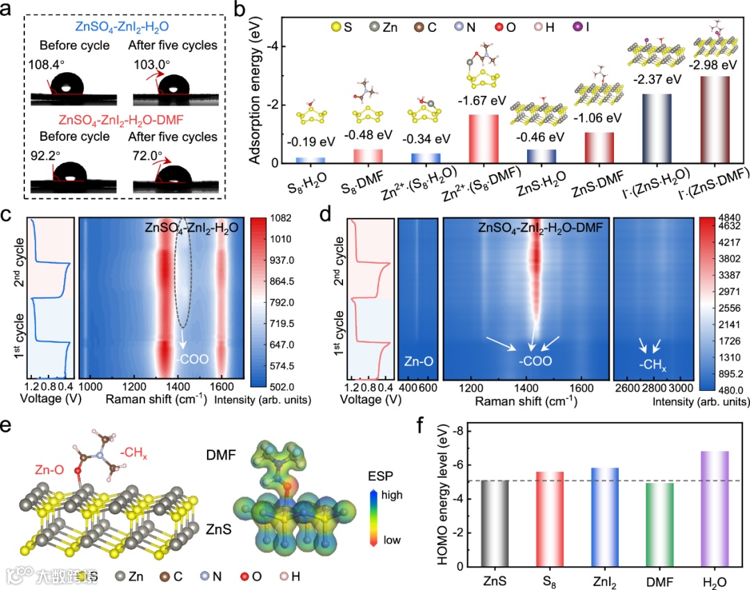 图2. (a)ZnSO4-ZnI2-H2O和ZnSO4-ZnI2-H2O-DMF电解液在硫电极上在25 °C和0.1 C下循环五次前后的接触角测试。(b)各种电解液溶剂分子和离子与S8和ZnS的计算吸附能值。(c,d)不同电解液中硫电极表面在25 °C和0.1 C下循环过程中的原位拉曼光谱。(e)DMF分子吸附在ZnS表面的吸附构型和静电势分布。(f)电极和电解液组分的最高占据分子轨道(HOMO)能级计算。