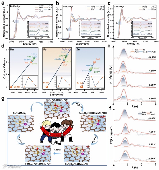 图2. 电化学条件下的原位XAFS光谱。FeZnMn‑TACs及标准样品在a) Fe K边、b) Mn K边、c) Zn K边的归一化XANES谱图。d) 施加电位下金属中心氧化态的变化趋势。e) Fe K边和f) Mn K边的k3加权FT-EXAFS谱图及相应拟合曲线。g) ORR过程中非对称配位场的动态重构过程。