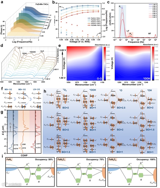 图3. 自旋重新分布的优化机制。a) 不同施加电位下的原位EIS测量,b) 相位值与频率的对比,c) FeZnMn‑TACs在不同电位下的DRT分布函数。d) FeZnMn‑TACs在不同电位下的原位ATR‑SEIRA谱图,e) O‑O和*OH区域的二维等高线图。f) 动态重构诱导的3d轨道电子重新分布。g) 动态FeNxCy构型的COHP分析。h) 不同重构构型下Fe中心与OCs之间的轨道相互作用示意图。i) d轨道占据度与增强耦合效应的内在联系。