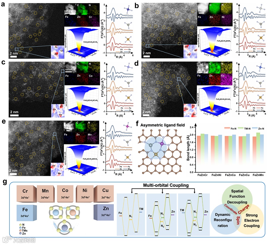 图1. 三金属单原子的精确鉴定。a) FeZnCr‑TACs、b) FeZnNi‑TACs、c) FeZnCo‑TACs、d) FeZnCu‑TACs和e) FeZnMn‑TACs的结构表征。左图:HAADF‑STEM图像,插图为选定区域的Gaussian拟合图。中上:EDS元素分布图。中下:Fe K边WT‑EXAFS等高线图。右图:k3加权Fe/Zn/TM K边EXAFS谱的傅里叶变换及相应拟合曲线。f) FeZnTM‑TACs不对称配位场示意图及M‑N键长统计。g) 三原子位点中的多重轨道耦合效应。