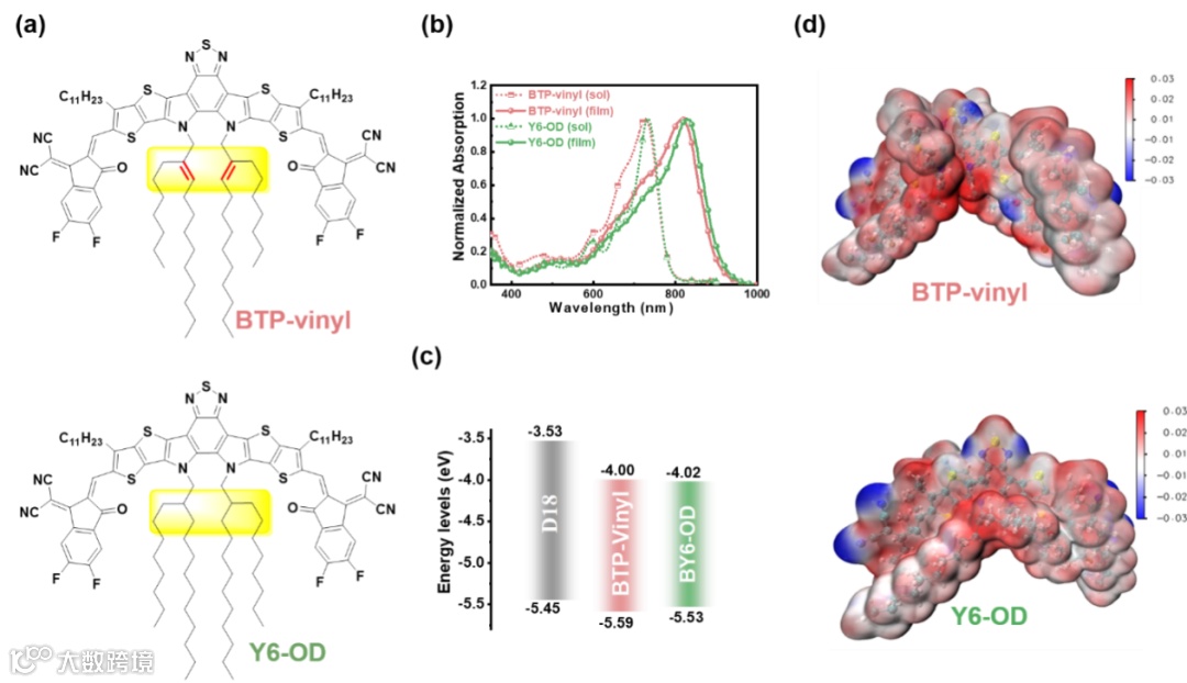图2 BTP-vinyl与Y6-OD的分子结构、吸收光谱、能级与静电势分布