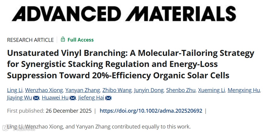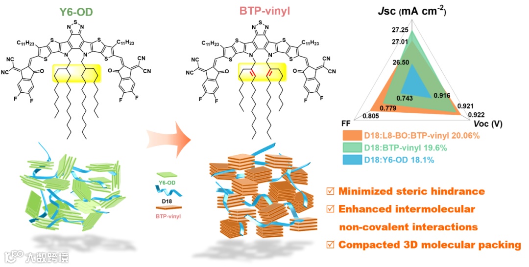 不饱和乙烯基支链:协同调控堆积与抑制能量损失的分子裁剪策略,实现效率超过20%的有机太阳能电池