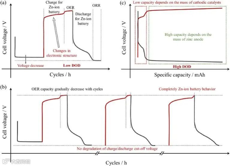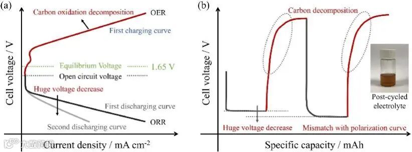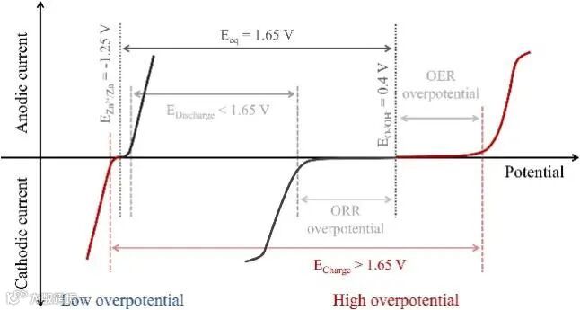 图2. 充放电过程中空气正极和锌负极反应的典型极化曲线。