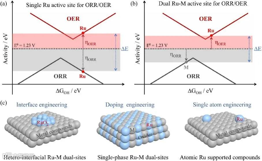 钌基复合催化剂的设计需平衡活性、稳定性与成本间的关键权衡。密度泛函理论研究表明,氧还原反应(ORR)与氧析出反应(OER)的催化活性受中间体吸附自由能之间的标度关系制约,其活性与OH的吉布斯自由能(ΔGOH)呈现火山型依赖关系。然而,ORR与OER的最优ΔG*OH值并不一致,这为设计高效双功能催化剂带来了显著挑战。如图所示,具有单一钌活性位点(如RuO2)的催化剂其ΔG*OH接近OER火山峰,但该值却远离ORR的最优活性区域,导致其ORR性能较差。这表明单一位点催化剂难以同时实现ORR与OER的高效协同。为克服钌基化合物固有的ORR缺陷,常见策略是引入额外活性组分或调控ORR/OER过程中钌位点的电子结构,以突破单一活性位点的限制。通过引入具有最优ΔG*OH的活性M位点并调控钌位点电子结构,可实现优越的双功能活性。基于钌配位环境的不同,这些复合策略主要分为三类:界面工程(异质界面Ru-M双位点)、掺杂工程(单相Ru-M双位点)以及单原子工程(化合物负载的原子级钌)。