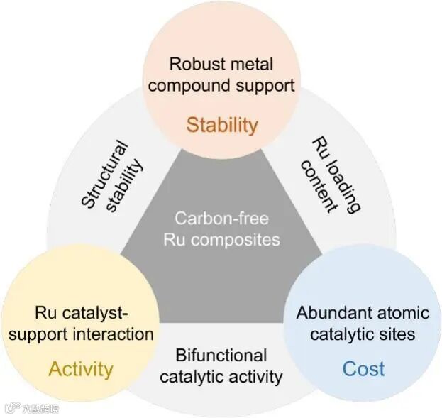 稳定性:开发具有本征稳定晶体结构的过渡金属化合物载体至关重要,应避免使用易发生不可逆结构变化的载体。对于会发生可逆相变的载体,催化剂设计必须明确考虑其在工作状态下的真实结构,以实现对钌化学环境的精确调控。此外,钌化合物在电化学氧化过程中易发生氧化溶解。因此,载体必须为钌原子提供稳固的锚定位点。