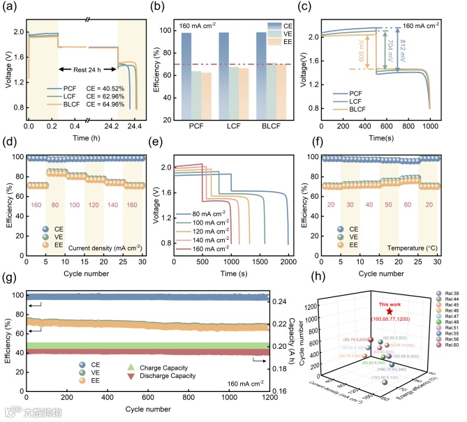 图5. 采用不同电极的锌溴液流电池(ZBFBs)性能对比。(a) 在80 mA cm-2下不同正极的自放电性能;(b) 在160 mA cm-2下不同正极的库仑效率、电压效率和能量效率;(c) 在160 mA cm-2下不同正极的充放电曲线;(d) 不同电流密度下BLCF的效率表现;(e) 不同电流密度下BLCF对应的充放电曲线;(f) 不同温度条件下BLCF的效率变化;(g) 在160 mA cm-2下BLCF的循环稳定性;(h) 已报道锌溴液流电池在电流密度、能量效率和循环寿命方面的性能对比。