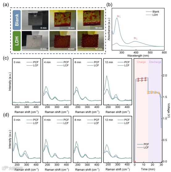 图2. 电极表面对溴物种的吸附能力及其在电化学反应过程中的演化行为。(a) 充电过程中,Blank与LDH样品对应的Pt电极表面形成的多溴物种的光学照片;(b) Blank与LDH电极浸泡后溴溶液的UV-Vis吸收光谱;(c, d) 锌溴液流电池中不同正极在 (c) 充电与 (d) 放电过程中不同时刻的拉曼光谱。