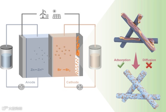 溴基液流电池凭借其较高的氧化还原电位、活性物质资源丰富及成本优势,被广泛认为是面向大规模储能的极具潜力的技术路线。然而,其实际应用仍长期受制于两大核心瓶颈:一方面,Br2/Br-氧化还原反应动力学迟缓,导致高倍率条件下极化严重、能量效率受限;另一方面,多溴化物在电解液中的扩散与跨膜迁移引发显著自放电和活性物质损失,严重削弱循环稳定性。传统研究多依赖溴络合剂或单一电极改性手段加以缓解,但往往以牺牲反应动力学或体系稳定性为代价。因此,如何在抑制溴穿梭的同时协同提升反应动力学,成为推动溴基液流电池走向高效率与长寿命的关键突破口。