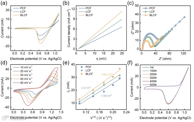 图4. PCF、LCF 与 BLCF 的电化学性能对比。(a) 扫描速率为10 mV s-1时的循环伏安(CV)曲线;(b) 扫描速率为1 mV s-1时的线性扫描伏安(LSV)曲线;(c) 交流阻抗Nyquist图;(d) 不同扫描速率下BLCF的CV曲线;(e) 阴极峰电流(Ic)与扫描速率平方根(v1/2)之间的线性关系;(f) BLCF在连续500次CV循环过程中的电化学稳定性。