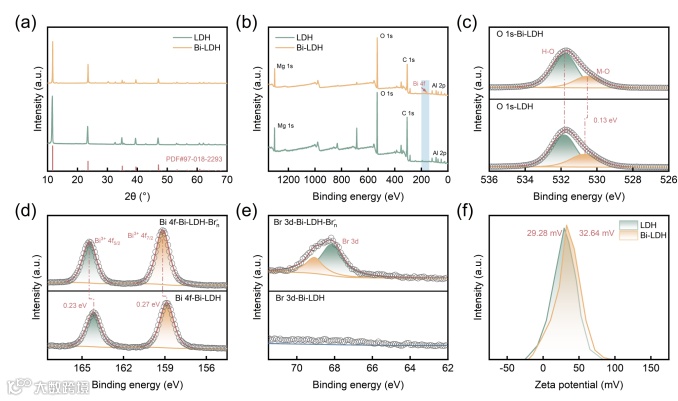 图3. LDH与Bi-LDH的结构及表面性质表征。(a) XRD衍射图谱;(b) XPS全谱图及 (c) O 1s高分辨谱;(d) Bi-LDH与Bi-LDH-Brn-样品的Bi 4f谱和(e) Br 3d谱;(f) Zeta电位测试结果。