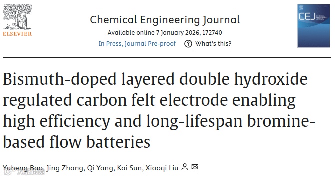 近日,太原科技大学刘晓奇团队在《Chemical Engineering Journal》上发表题为“Bismuth-doped layered double hydroxide regulated carbon felt electrode enabling high efficiency and long-lifespan bromine-based flow batteries”的研究文章。研究表明,LDH层状结构对多溴化物具有强吸附作用,可显著抑制溴扩散与跨膜迁移;同时,Bi掺杂在LDH晶格中引入电子调控中心,显著加速Br2/Br-氧化还原反应动力学。基于BLCF组装的锌溴液流电池在160 mA cm-2高电流密度下表现出低极化、高能效及超过1200次的稳定循环寿命。该研究为构建“固溴–催化”双功能协同电极提供了新思路,为溴基液流电池的高性能化与长寿命化提供了重要支撑。