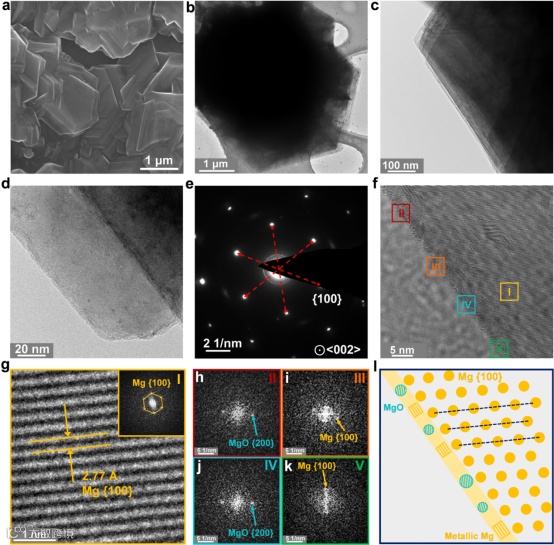 图3. MgCl2改性的Mg(OTf)2/DME电解液中片状镁沉积及其界面的微观结构。