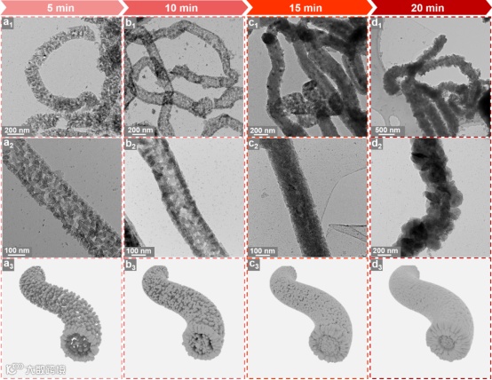 图1. Mg(OTf)2/DME电解液中须状镁沉积形貌的演化过程。