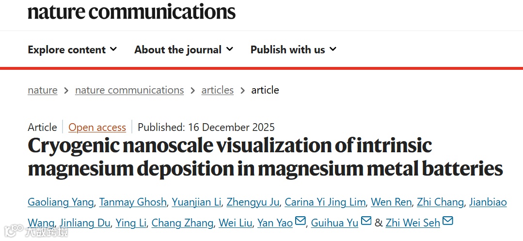 近日,新加坡科技研究局Seh Zhi Wei教授团队,德克萨斯大学奥斯汀分校余桂华教授团队和休斯顿大学姚彦教授团队合作,在镁金属电池基础研究领域取得重要进展。研究团队创新性地采用冷冻透射电子显微镜(cryo-TEM)技术,系统揭示了镁金属沉积形貌的本征特性及其与界面钝化反应之间的内在关系。相关研究成果以 “Cryogenic nanoscale visualization of intrinsic magnesium deposition in magnesium metal batteries”为题,发表于国际知名期刊Nature Communications。该成果在实验层面澄清了镁金属电池领域长期存在的关键争议,为镁金属负极界面调控和电解液设计提供了新的理论依据,对推动高安全、高能量密度新型储能体系的发展具有重要科学意义。