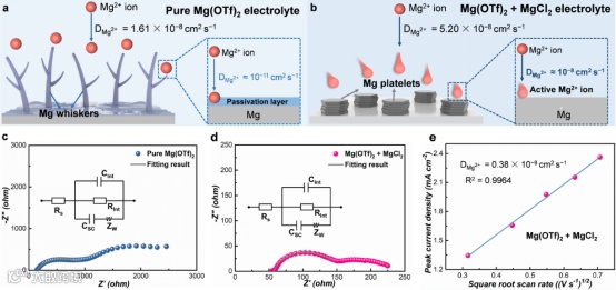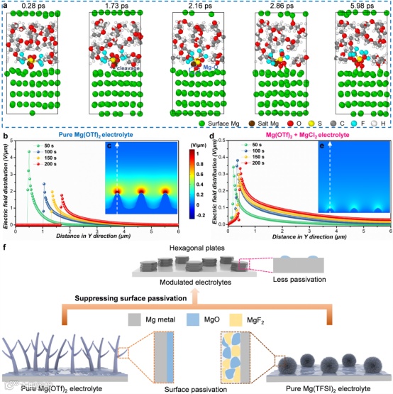 在实验表征的基础上,进一步引入多尺度理论模拟对沉积行为进行解释与验证。第一性原理分子动力学模拟表明,在Mg(OTf)2/DME等体系中,阴离子与溶剂分子可在镁表面发生分解反应,生成稳定的氧化产物,从原子尺度上支持了MgO钝化层形成的实验观察。经典分子动力学与相场模拟则从介观尺度揭示了界面扩散受限对沉积形貌演化的影响。模拟结果显示,当界面扩散系数降低至一定阈值以下时,沉积过程不可避免地转向局部优先生长,进而产生须状枝晶结构;而在扩散条件改善的情况下,沉积趋于平面化和片状化。实验结果与模拟结论之间的高度一致性,使得界面钝化、离子传输与形貌演化之间的关系得到了较为完整的论证。