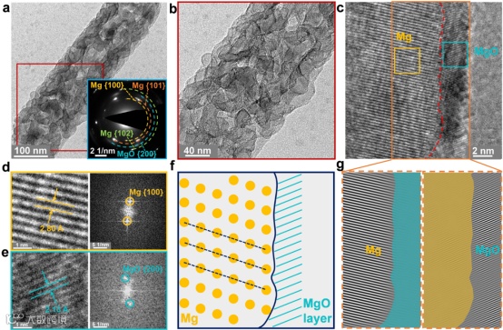 图2. Mg(OTf)2/DME电解液中须状镁沉积及钝化界面的微观结构。