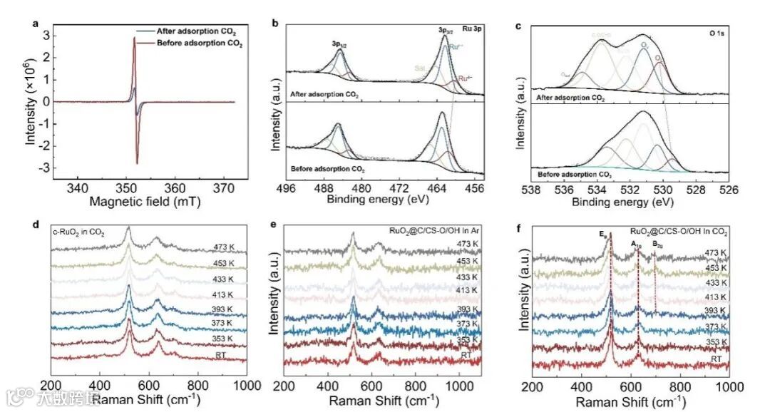 图3:(a-c)化学脉冲吸附CO2前后的电子顺磁共振光谱分析、XPS分析。(d-f)CO2和Ar下不同温度作用时原位拉曼谱图。