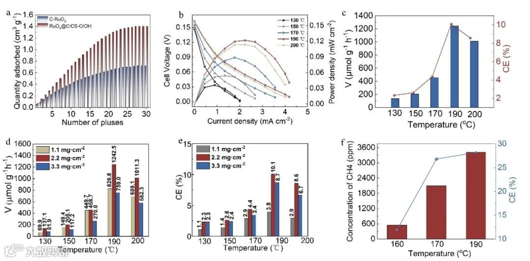 图2:(a)化学脉冲吸附CO2。(b)复合材料作为阴极时CO2/H2燃料电池放电性能。(c)CO2还原速率以及效率(载量固定为2.2 mg cm-2)。(d,e)不同载量下CO2还原速率以及效率。(f)大电池反应面积下生成的甲烷浓度以及甲烷生成效率。