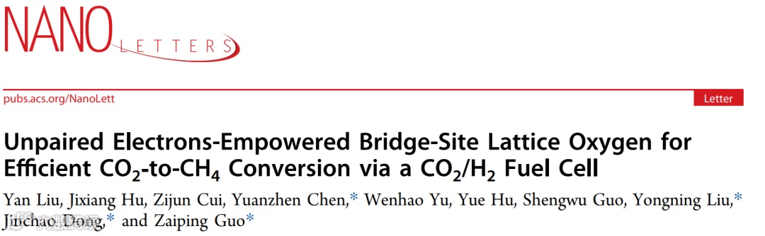 近日,来自西安交通大学的陈元振教授、柳永宁教授与厦门大学的董金超教授以及阿德莱德大学的郭再萍教授(现已加盟香港城市大学)合作,在国际知名期刊Nano Letters上发表题为“Unpaired Electrons-empowered Bridge-Site Lattice Oxygen for Efficient CO2-to-CH4Conversion via a CO2/H2 Fuel Cell”的研究论文。该论文设计了一种含有异常丰富未成对电子的RuO2基复合材料,该材料中的未成对电子不仅可有效激活传统金属位点也可赋能桥位晶格氧形成双活性位点,与CO2分子发生高度杂化,有效吸附活化CO2。在CO2/H2燃料电池中,该催化剂催化CO2转化为CH4的速率是常规RuO2/CNTs的18.6倍。此外,研究者通过增大电池反应面积,让CO2分子有更多的机会参与反应,进一步提升了甲烷产率。该研究对推动CO2还原新方法的发展以及开发高活性CO2还原催化剂具有指导意义。