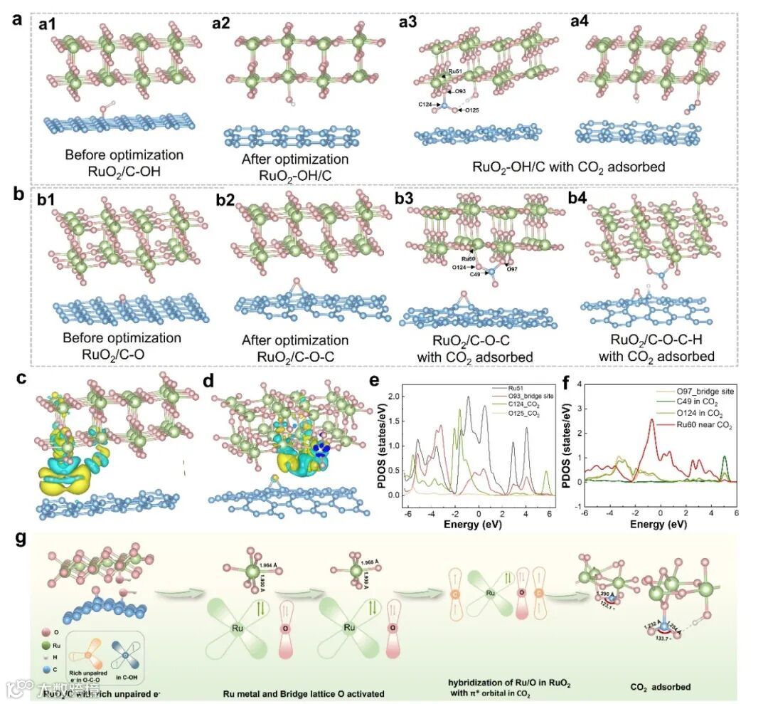 理论计算证明结构优化后碳载体的羟基官能团会跃迁到钌位点,且-OH和C=O基官能团附近会显著吸附活化CO2分子,使其键长变长,分子发生弯曲,而远离官能团的位点,CO2分子难以吸附。分波态密度计算表明在羟基的影响下,RuO2晶格氧的O 2py/2pz会与CO2中C 2py/2pz发生轨道杂化,而在羰基的作用下,Ru的 dxz/dyz/dz2 轨道与CO2的O 2px轨道发生杂化,产生电荷转移。这一结果表明,在材料制备过程中碳的未成对电子转移到了钌和晶格氧位点,激活了桥位氧和钌金属中心,使得Ru-O键变长。激活的钌和晶格氧可与CO2分子发生轨道杂化,并向CO2反键轨道注入电子活化CO2分子,使其键长变长并发生弯曲。