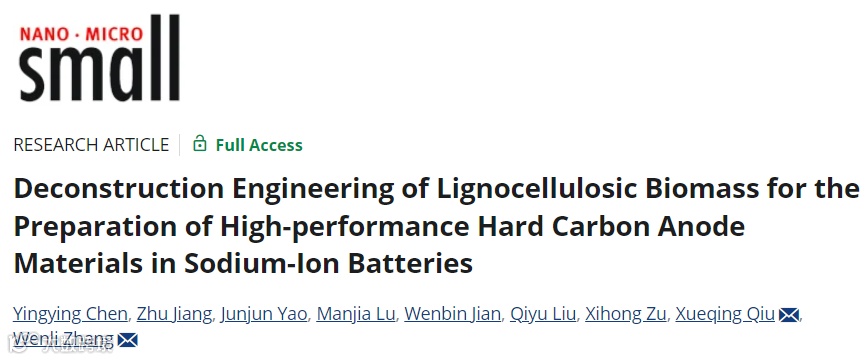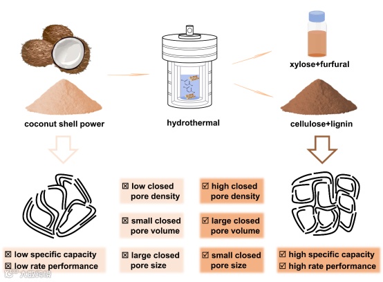 近日,来自广东工业大学的邱学青教授和张文礼教授合作,在知名期刊Small上发表题为“Deconstruction Engineering of Lignocellulosic Biomass for the Preparation of High-performance Hard Carbon Anode Materials in Sodium-Ion Batteries”的观点文章。该观点文章提出一种低腐蚀性的马来酸水热预处理策略,有效地去除了椰壳中的半纤维素,同步回收了液相产物木糖和糠醛。所得富含木质素和纤维素的前驱体衍生硬炭的闭孔孔径减小,闭孔体积增大。硬炭表现出了高比容量及优异的倍率性能。