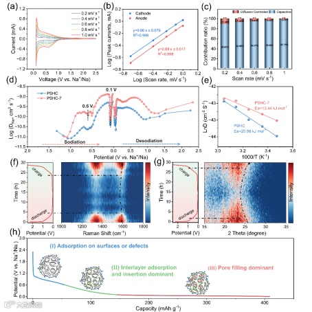 图4. (a)PSHC-7不同扫速下CV曲线;(b)根据不同扫速CV曲线拟合的b值;(c)不同扫速下赝电容行为贡献占比;(d)PSHC与PSHC-7负极的Na⁺扩散系数;(e)阿伦尼乌斯曲线;(f)原位拉曼图谱;(g)原位XRD图谱;(h)PSHC-7的Na⁺存储机制示意图。