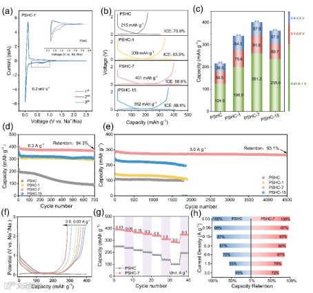 在恒流充放电测试中,未经改性的PSHC电极仅具有70.9%的首周库伦效率和289 mAh/g的可逆比容量,长循环稳定性和倍率性能较差。改性后的PSHC-7电极表现中明显提升的储钠性能:首周库伦效率高达88.6%,可逆容量达到401 mAh/g。且具有优异的长循环稳定性:在0.3 A/g电流密度下具有389 mAh/g的比容量,循环700次后依然实现了94.3%的容量保持率。PSHC-7电极在保持电极结构稳定性和循环性能的同时,还表现出优异的动力学性能。在不同电流密度下的可逆容量分别为:401 mAh/g(0.03 A/g)、388 mAh/g 1(0.06 A/g)、372 mAh/g(0.15 A/g)、361 mAh/g(0.3 A/g)、349 mAh/g(0.6 A/g)、315 mAh /g(1.5 A/g)、289 mAh/g(3.0 A /g)。如图3(h)所示,PSHC-7电极在3.0 A/g时依然具有72%的容量保持率,而PSHC仅有41%。此外,在超高电流密度下,PSHC-7负极不仅具有优异的可逆容量,而且还保持优异的长期循环寿命(在3.0 A g–1电流密度下循环4500次后容量保持率为93.1%)。这种卓越的速率性能可归因于伪石墨域与孔隙结构的协同优化,已通过后续的测试得到了证实。