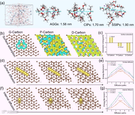 图5. (a)1M NaPF6/DIGLYME电解液的分子动力学模拟及其AGG、CIP、SSIP团簇尺寸; Na+在G-碳、P-碳和D-碳(b,c)表面吸附能垒;(d,e)表面扩散能垒;(f,g)体相扩散能垒的DFT计算结果对比。