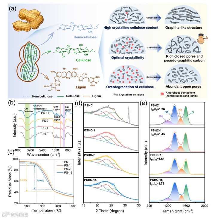 图1. (a)PSHC-x制备流程及机理示意图; 花生壳前驱体的:(b)红外光谱和(c)热重曲线;制备硬碳的(d)XRD(002)峰拟合图像(e)拉曼光谱图