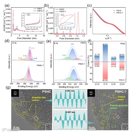 图2. PSHC-x的结构表征:(a)PSHC和PSHC-7的N2吸附-脱附孔径分布曲线(插图为N₂吸附-脱附等温线);(b)CO₂吸附-脱附孔径分布曲线(插图为CO2吸附-脱附等温线);(c)小角X射线散射图谱;(d)C 1s和(e)O 1s的XPS能谱;(f)官能团占比统计图;(g)PSHC和PSHC-7的高分辨透射电镜图像。