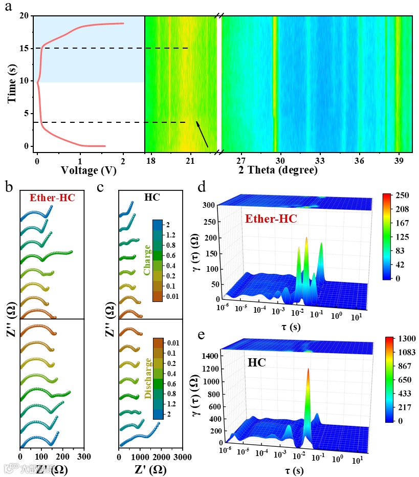 图4. (a) Ether-HC|SSEs|Na的原位XRD图谱。(b) Ether-HC|SSEs|Na和(c) HC|SSEs|Na半电池在首次放电和充电过程中不同电位下的原位EIS。(d) Ether-HC和(e) HC半电池在0.1 C电流密度下不同电位下的DRT变换。