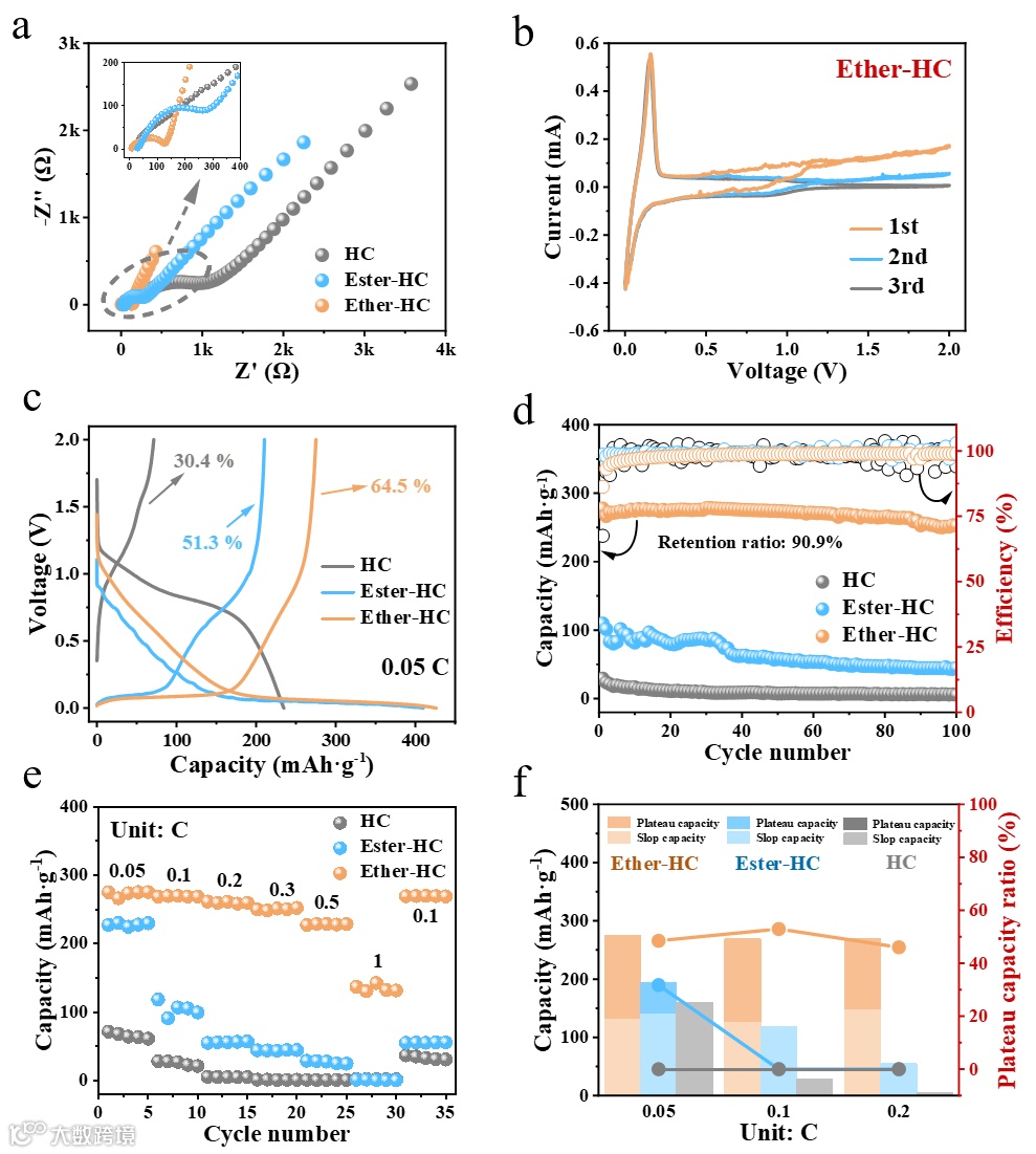 图3. (a) HC|SSEs|Na、Ester-HC|SSEs|Na 和 Ether-HC|SSEs|Na 半电池的奈奎斯特图。(b) Ether-HC|SSEs|Na 电池在扫描速率为 0.1 mV s⁻¹ 下的前三圈 CV 曲线。(c) 0.05 C 下第一圈的充放电曲线。(d) HC|SSEs|Na、Ester-HC|SSEs|Na 和 Ether-HC|SSEs|Na 半电池在 0.1 C 下的循环性能。(e) HC|SSEs|Na、Ester-HC|SSEs|Na 和 Ether-HC|SSEs|Na 半电池在 0.05 C 到 1 C 不同倍率下的倍率性能及 (f) 相应的斜坡区和平台区容量的贡献。
