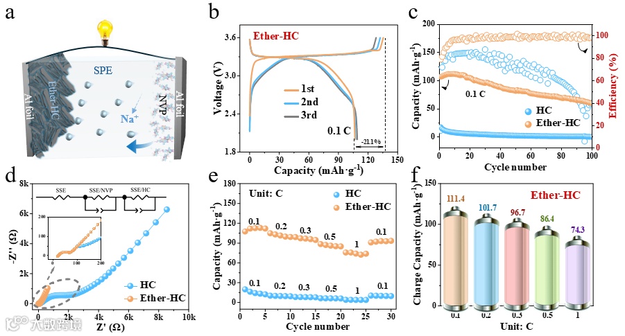 图5. (a) 全电池构型示意图。(b) Ether-HC|SSEs|NVP 在 0.1 C 下的典型 GCD 曲线。(c) HC|SSEs|NVP 和 Ether-HC|SSEs|NVP 在 0.1 C 下的循环性能。(d) HC|SSEs|NVP 和 Ether-HC|SSEs|NVP 电池的奈奎斯特图。(e) HC|SSEs|NVP 和 Ether-HC|SSEs|NVP 电池的倍率性能及 (f) 相应的比容量。所有电池均在无外部压力条件下测试。